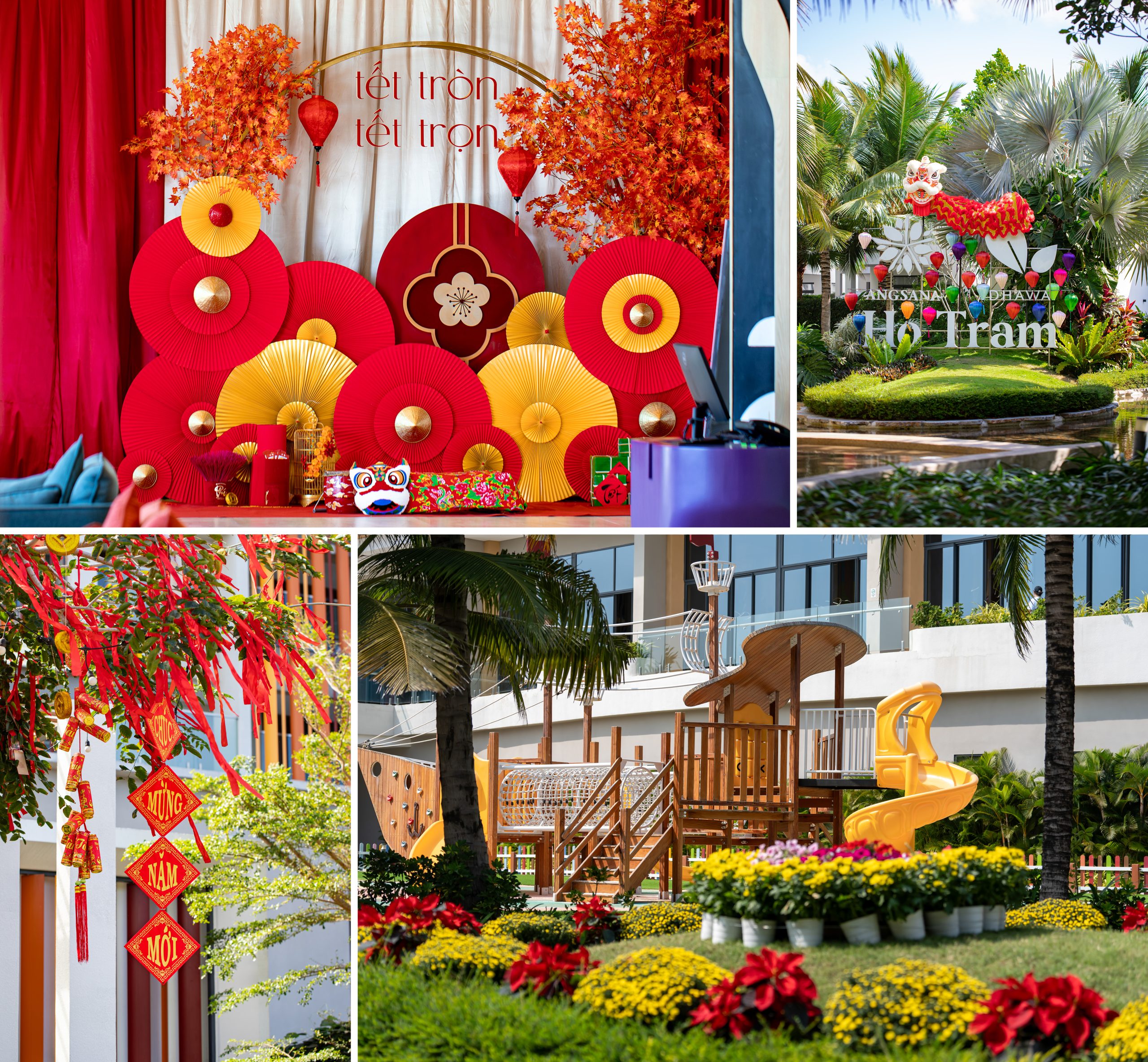 Tại Angsana & Dhawa Hồ Tràm (xã Hồ Tràm, TP.HCM), không khí Tết cổ truyền được tái hiện thông qua những chi tiết trang trí quen thuộc như quạt giấy đỏ, bánh chưng xanh, câu đối, cây nêu ngày Tết… tạo cảm giác gần gũi giữa không gian nghỉ dưỡng ven biển. Không ồn ào, xô bồ, Tết ở đây hiện diện nhẹ nhàng, chậm rãi, phù hợp với nhóm du khách tìm kiếm sự thư thái trong những ngày đầu năm.